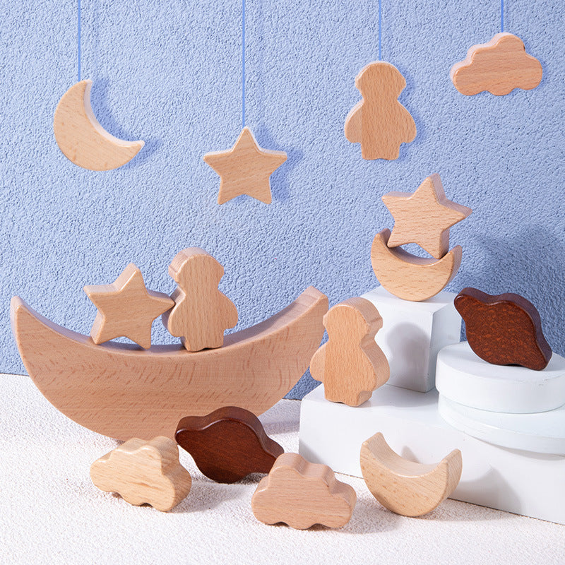 The "Wooden Children's Moon Balance Building Blocks" are crafted from safe and eco-friendly wood, ensuring a non-toxic playtime experience for infants and toddlers. The moon-themed design adds a touch of whimsy and charm to the play set.
